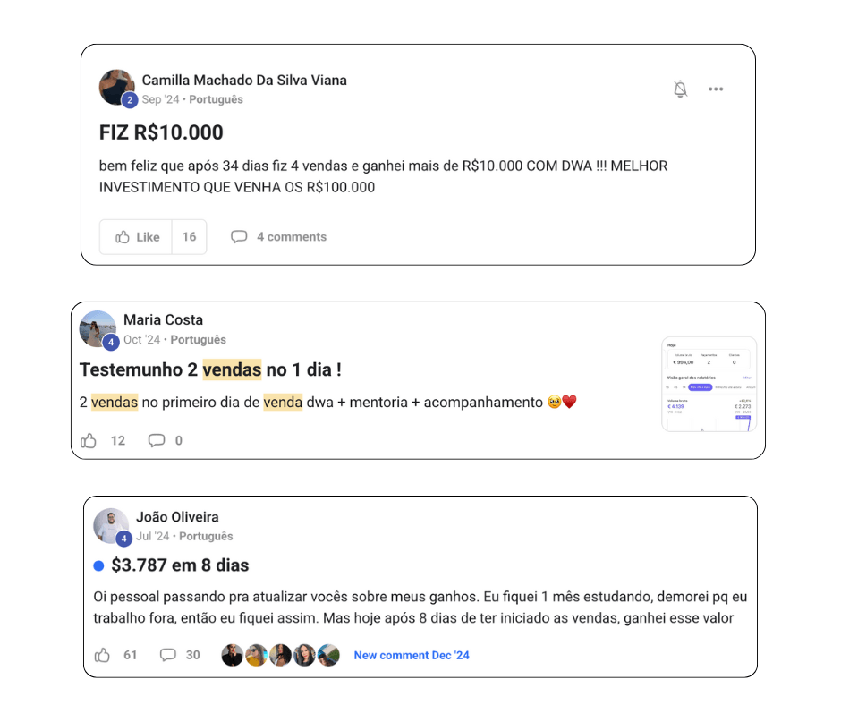 Se você deseja fazer renda extra de maneira simples, sem planos mirabolantes, o DWA é para você! Este programa tem tudo coberto para você. Nenhum outro programa no mercado me gerou mais receitas de 6 dígitos em um mês do que o DWA.
